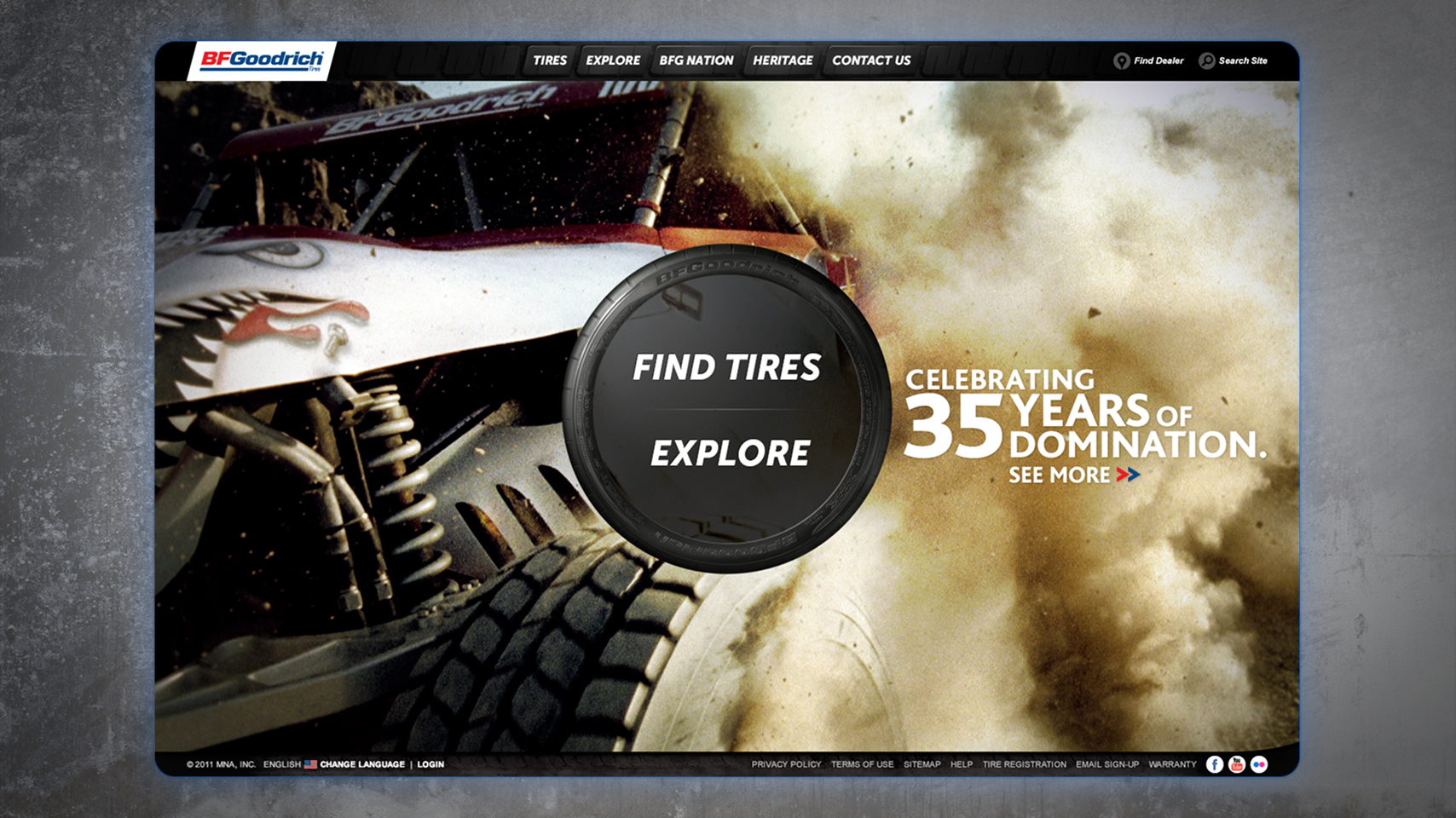 The homepage has full bleed immersive imagery that captures the essence of BFG's tires.