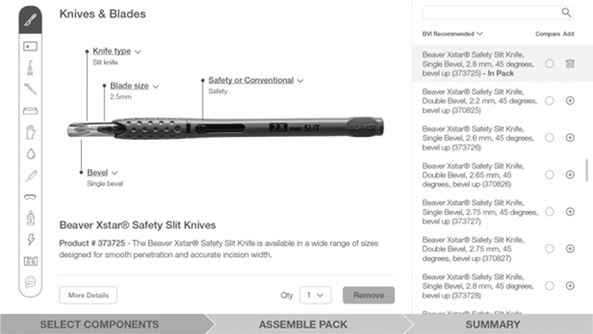 An intuitive interface to select components, assemble a pack, and deliver a quote.